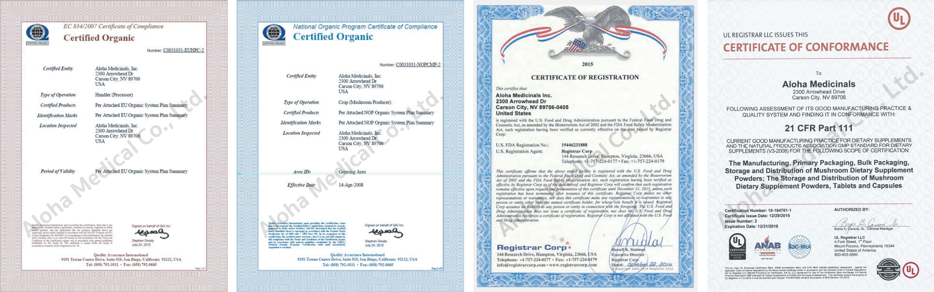 Aloha Medicinals Inc. is one of the largest and most technologically advanced producers of USDA and EU Certified Organic medicinal mushrooms and mushroom-derived compounds in the world today. All of the Aloha Medicinals’ raw materials are produced in the United States in Carson City, Nevada under FDA certified Good Manufacturing Practice (cGMP) regulations, licensed by the State of Nevada as a food manufacturing plant, fully certified 100% Organic under USDA and EU regulations. All Aloha Medicinals mushroom products are grown using only Certified Organic, American produced raw materials, with no GMO or imported ingredients used.