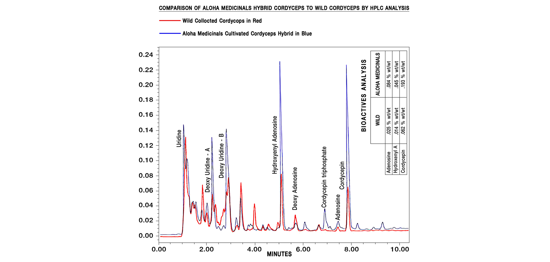 As you can clearly see, the Blue Line (Aloha Medicinals Cordyceps) peaks higher than the Red Line (Wild Cordyceps) for every single component.